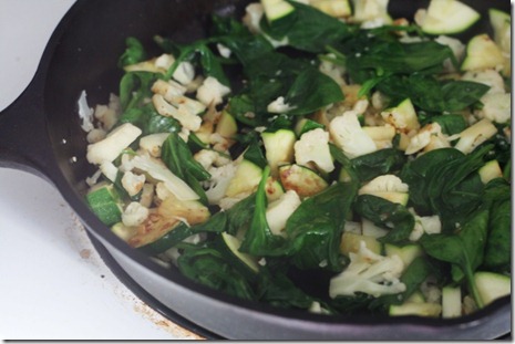 Add cauliflower and zucchini and sauté for 3-5 minutes until vegetables are tender (mine even got slightly browned in my pan which is good too).  Add the fresh spinach leaves and sauté for about 2 more minutes or until spinach is wilted down.